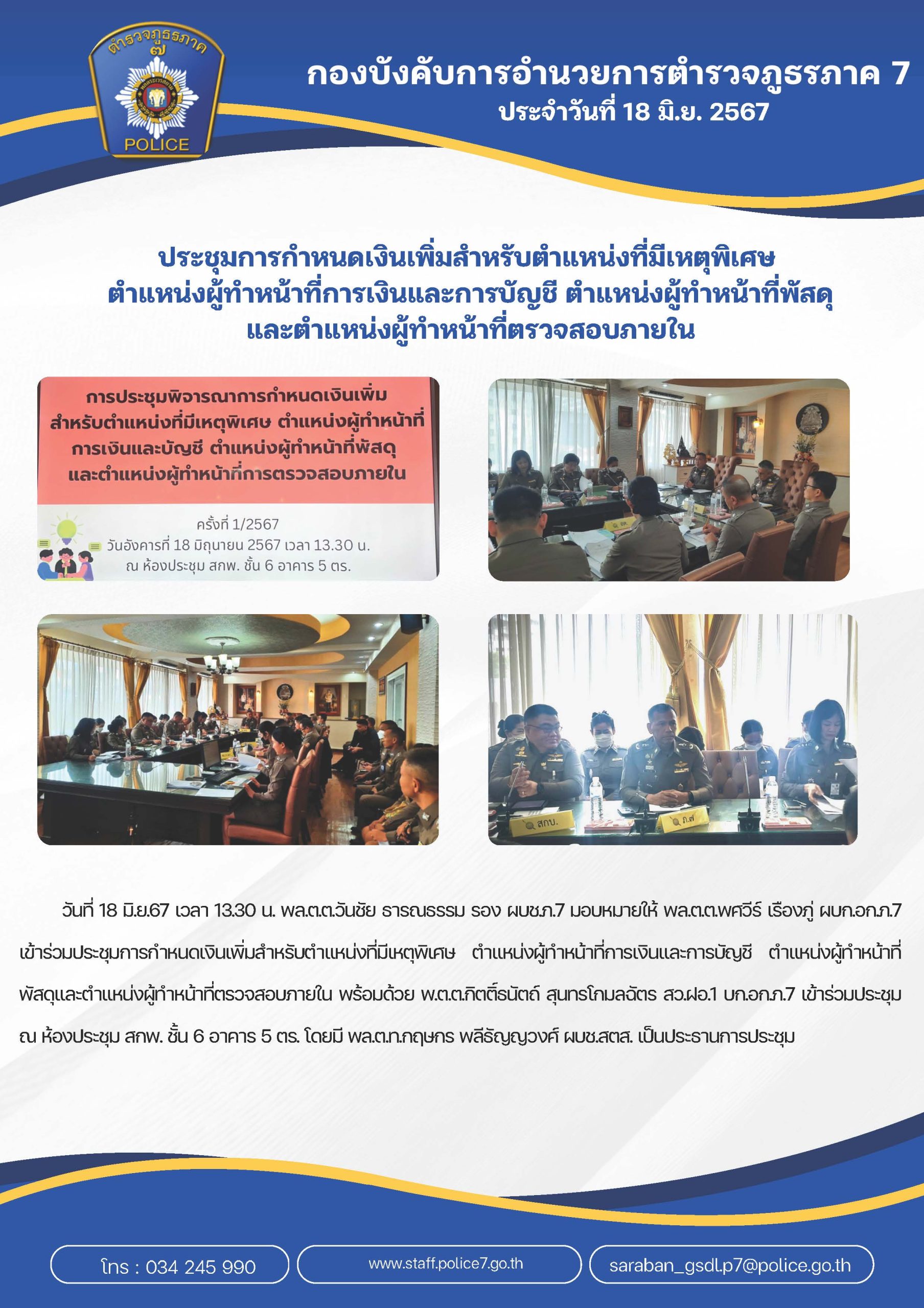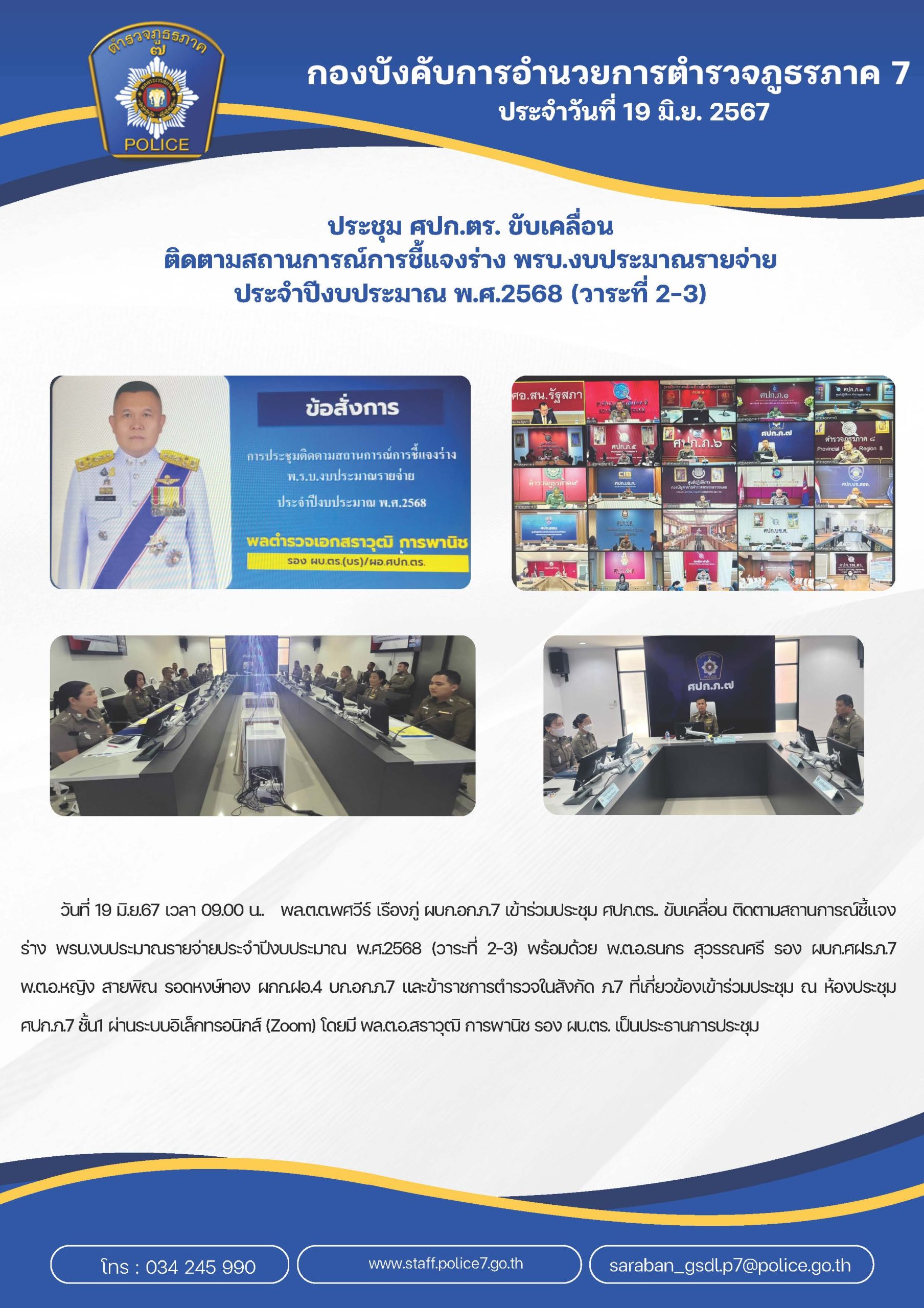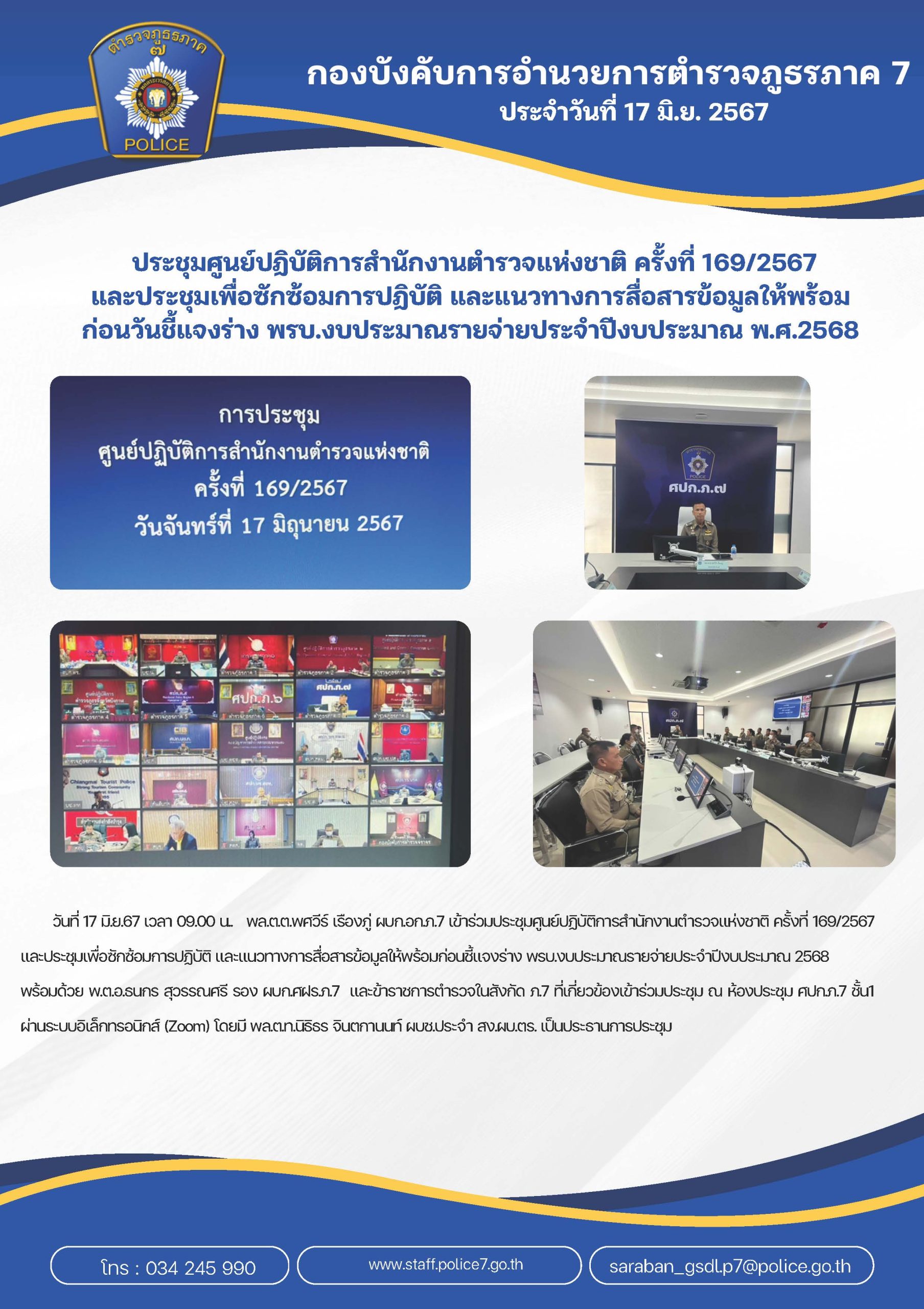 ประชุมฝ่ายอำ นวยการ บก.อก.ภ.7 ครั้งที่ 6/2567 วันที่ 2 ก.ค.67 เวลา 10.30 น. พล.ต.ต.พศวีร์ เรืองภู